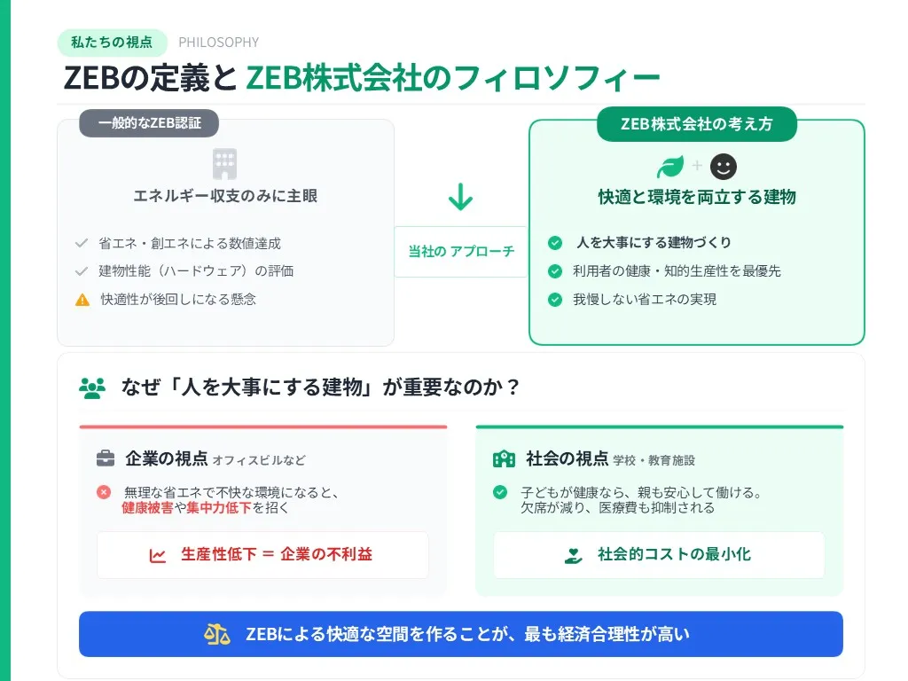 環境に配慮しつつ快適な生活空間を作るには、ZEB株式会社によるZEB可能性調査サービスが非常に重要です。これまでの「我慢の省エネ」から脱却し、人々の健康と快適性に配慮した建物づくりが求められています。