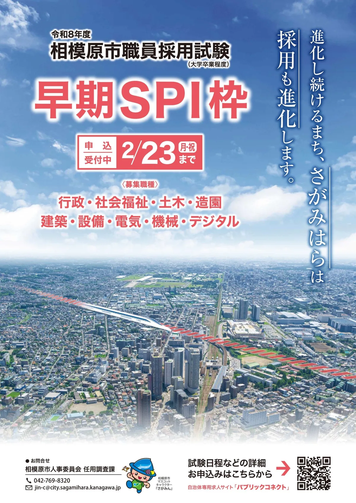 神奈川県相模原市では、令和8年度の職員採用試験を実施しています。この試験では、大卒程度の人材を対象に、早期SPi枠を設け、特別な公務員試験対策が不要な形で進められます。応募は2月23日(月・祝)までとなっており、この機会にぜひフレッシュな人たちの参加を待っています。