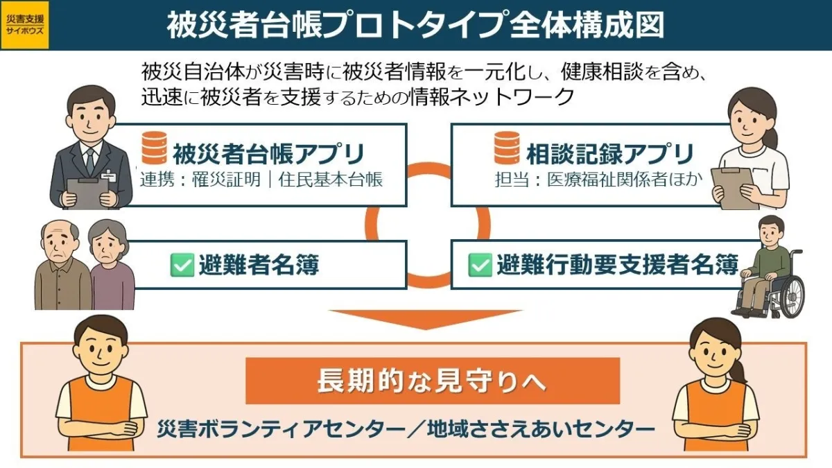 このシステムは、発災直後から生活再建までの支援情報を一元管理し、医療・介護情報の安全な連携を実現します。これにより、被災者はスムーズに支援を受けられ、生活の再建が加速します。また、外部の支援団体とも連携し、長期的な見守り体制を構築します。