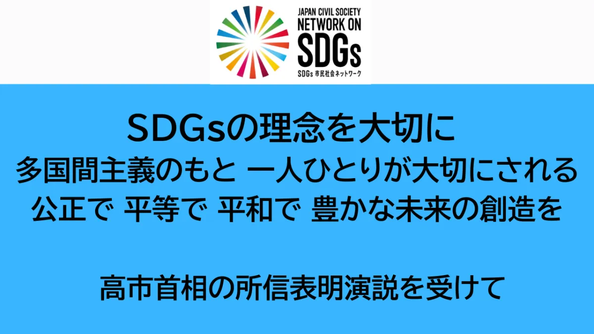 2025年10月21日に第104代内閣総理大臣に選出された高市早苗新首相は、10月24日に行われた所信表明演説で、SDGsの理念を基にした公正で平等、そして豊かな未来の創造を呼びかけました。この発表に対し、一般社団法人SDGs市民社会ネットワーク(SDGsジャパン)は、持続可能で包摂的な社会を築くことが未来の鍵であるとの見解を示しました。