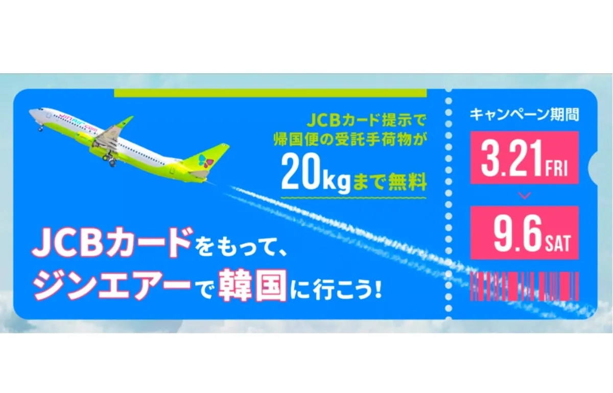 株式会社ジェーシービー(JCB)と韓国の格安航空会社ジンエアーが協力し、「JCBカードをもって、ジンエアーで韓国に行こう!」というキャンペーンを実施することが発表されました。このキャンペーンは2025年の3月21日から9月6日までの間、ジンエアーの日本から韓国への直行便の往復航空券を購入した顧客を対象にしています。