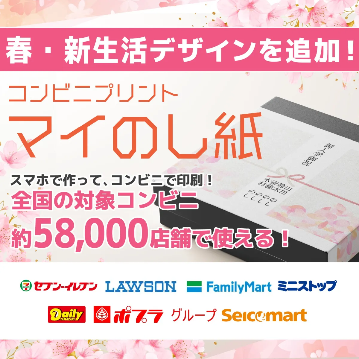 コンビニで手軽にプリントできるサービス『マイのし紙』が、春向けの新デザインを追加し、リニューアルを決定しました。この春は卒業や入学、転職など、新たな門出を迎える人々にとって特別な季節です。そんな思いを伝えるために、心を込めたのし紙のデザインを用意しました。