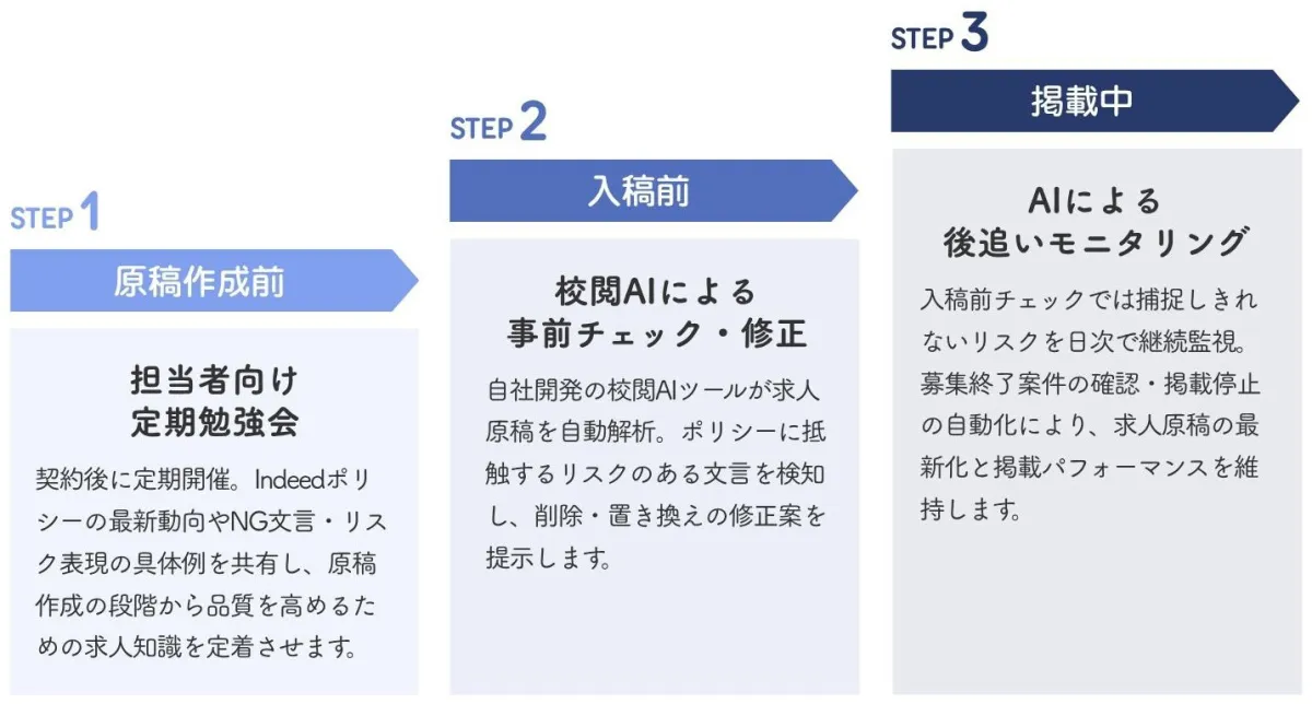 この3つのステップは、リライアスのIndeed広告運用支援と連携して提供され、原稿の品質を管理し、再入稿までを一貫してサポートします。