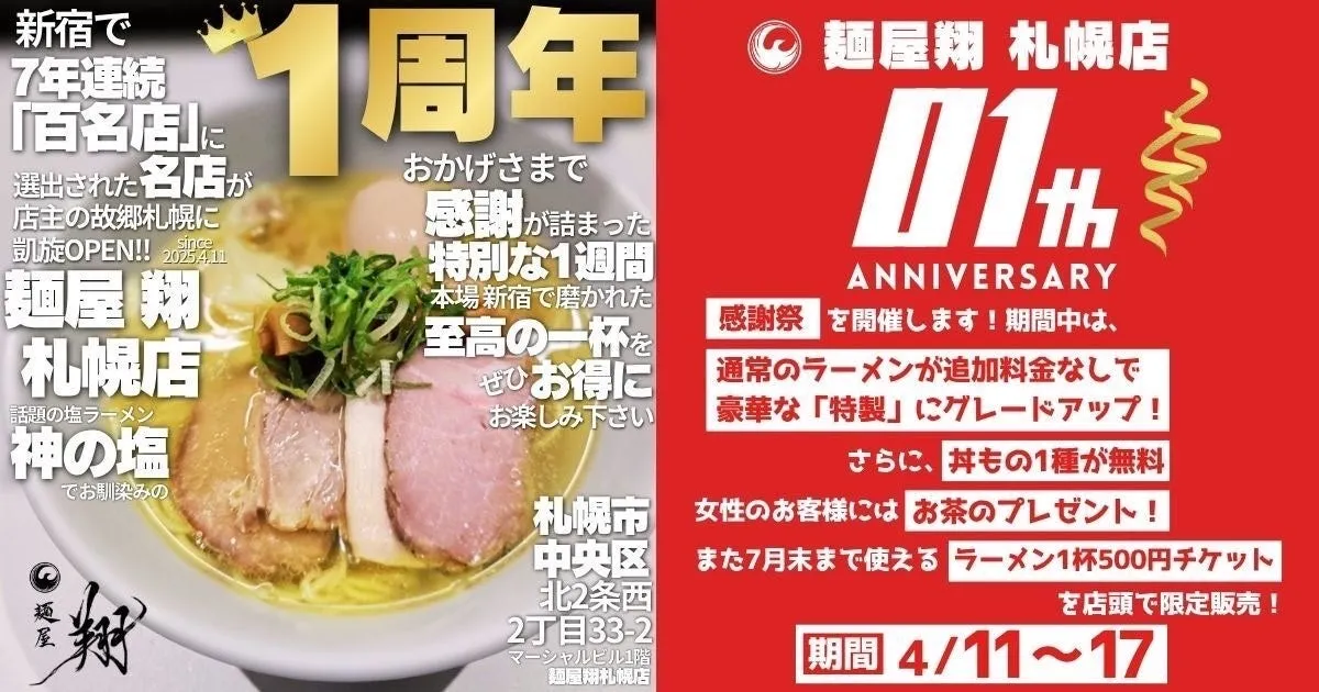 札幌市のラーメンファンに朗報です!「麺屋翔 札幌店」は、この度開店から1周年を迎えます。その感謝の気持ちを込めて、特別なイベント「1周年感謝祭」を2026年4月11日(土)から4月17日(金)までの一週間、開催します。