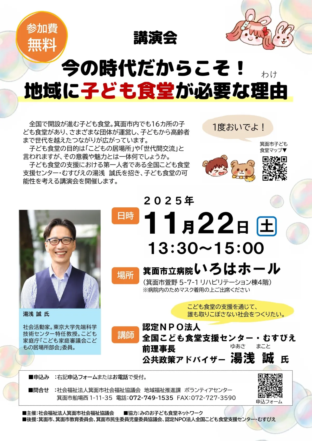 2025年11月22日(土)、箕面市で行われる講演会についてご紹介します。この講演会は、地域における子ども食堂の意義や魅力に触れ、その未来の可能性を考える重要な機会です。