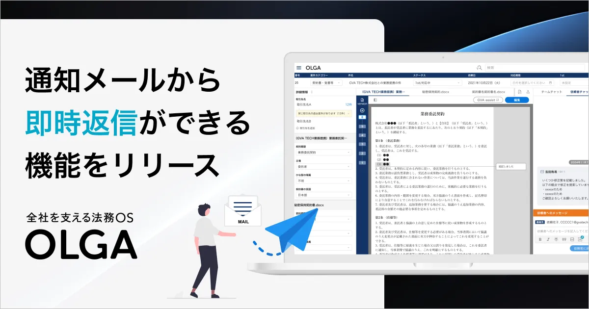 GVA TECH株式会社(本社:東京都渋谷区、代表取締役:山本俊)は、法務業務を支える新しい機能をOLGAに追加したことを発表しました。この機能により、法務部門や事業部門のユーザーが通知メールに直接返信できるようになり、業務フローが大幅に改善されます。これまで法務部門のユーザーはOLGAにアクセスしてからメールに返信する必要がありましたが、今回の機能追加によってこの手間が省かれ、業務の効率が向上しました。