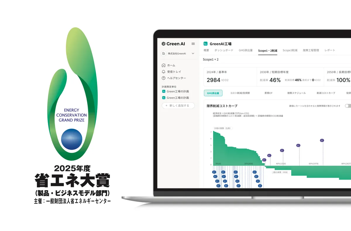 株式会社Green AIは、脱炭素計画策定システム『Green AI』が2025年度省エネ大賞の製品・ビジネスモデル部門にて「審査委員会特別賞」を受賞したことを発表しました。この受賞は、脱炭素や省エネ、さらにコスト削減に実効性を持つ取り組みを継続的に推進した成果として評価されたものです。