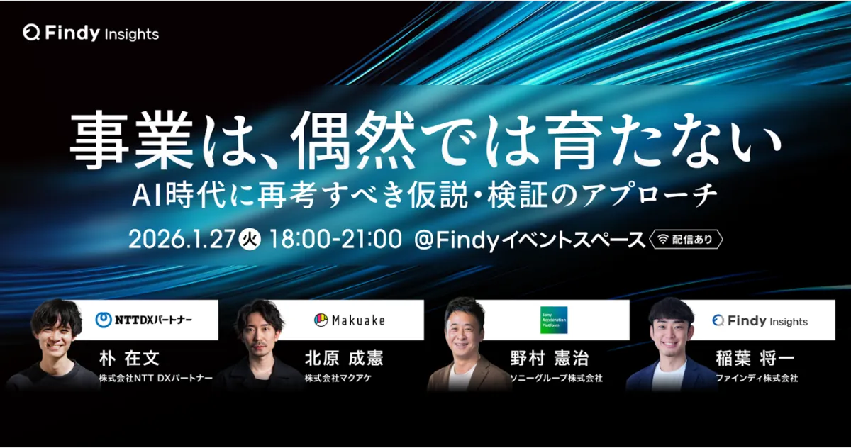 2026年1月27日、ファインディ株式会社が主催するハイブリッドイベント「事業は、偶然では育たない──AI時代に再考すべき仮説・検証のアプローチ」が開催されます。このイベントでは、株式会社NTT DXパートナー、株式会社マクアケ、ソニーグループ株式会社の事業開発スペシャリストが一堂に会し、AIと人間の共演による未来の事業開発について考察されます。特に、最近の企業の停滞感に焦点を当て、技術があっても事業が進まない現状を打破するための戦略が議論されます。