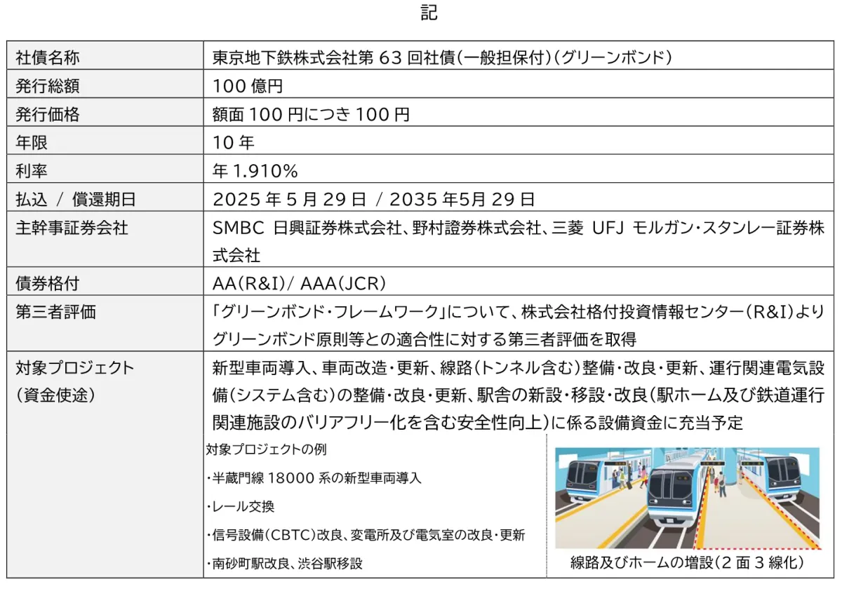 今回発表された発行条件に関する詳細は、東京メトロの公式ホームページで確認できます。ページ内では、評価基準やプロジェクトの具体的な内容についても言及されており、投資家が関心を持ちやすい情報が集約されています。