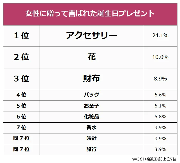 調査の結果、女性に喜ばれるプレゼントランキングは以下の通りです。
