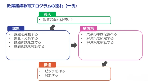 アントレプレナーシップ教育は、自ら社会的な問題を見つけ、解決策に挑む能力を育成する教育の一環です。PEPは、この教育プログラムを通じて政策起業家精神を醸成し、地域の具体的な政策課題に取り組む機会を提供します。対象は高校生から大学2年生までで、地域の実情に密着した問題に焦点を当て、学生自らが解決策を考案することを重視しています。