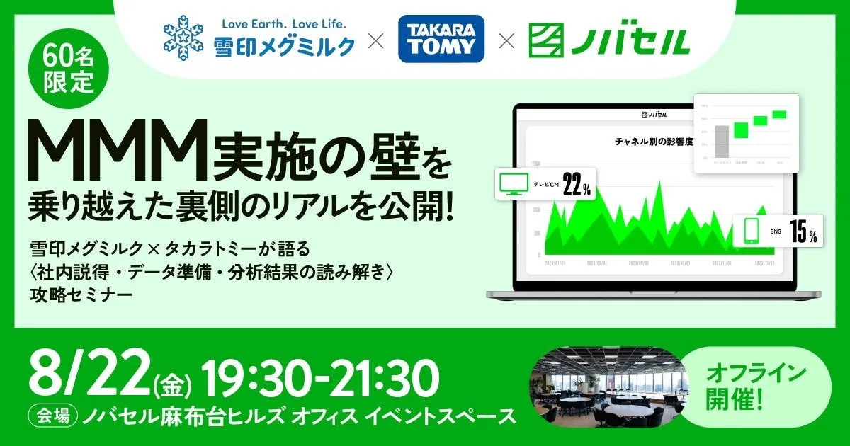 ノバセル株式会社は、2025年8月22日(金)に、特別なオフラインイベント「“MMM実施の壁”を乗り越えた裏側のリアルを公開!」を開催します。このセミナーには、雪印メグミルク株式会社と株式会社タカラトミーという、消費財・食品・化粧品業界のトップ企業が登壇し、マーケティング・ミックス・モデリング(MMM)に関する貴重な知見を直接聞くことができる貴重な機会です。