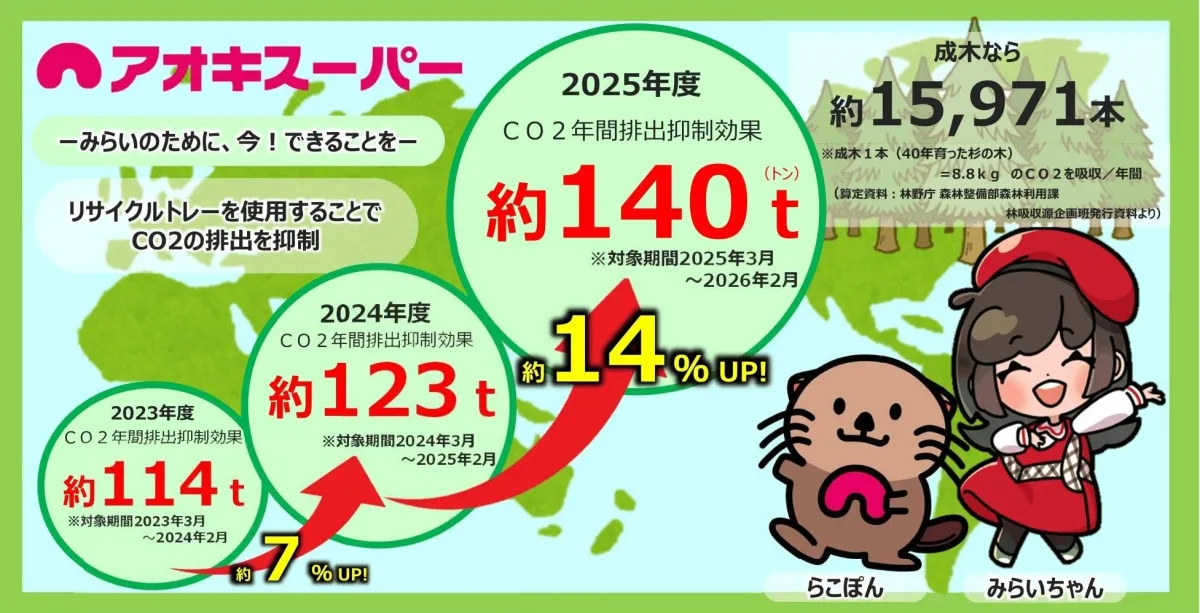株式会社アオキスーパーは、未来の地球のために、使用済み食品トレーの回収とリサイクル活動を進めています。近年、これらの取り組みにより、CO₂の年間排出抑制効果が前年比で約14%増加しました。この成果は、小さなリサイクルの一歩が、環境に大きな影響を与えられることを示す好例です。