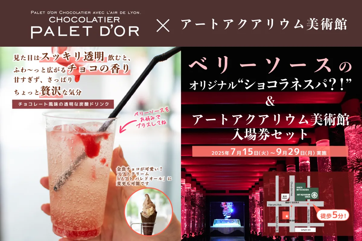 アートアクアリウム美術館では、2025年7月15日から9月29日まで、ショコラティエパレドオールが手掛けたオリジナルの炭酸ドリンクがセットになった入場券を販売します。この新しいドリンク“ショコラネスパ?!”は、独自の製法で作られたショコラの香りと味を楽しめるユニークな飲み物です。透明でありながら、飲むとふわっと広がるチョコレートの香りが新感覚を提供します。