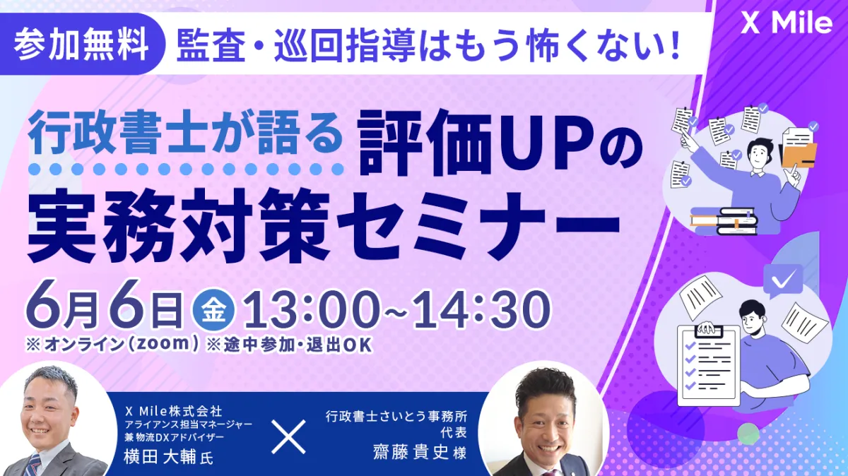 X Mile株式会社と行政書士さいとう事務所が共催する「監査・巡回指導はもう怖くない!行政書士が語る評価UPの実務対策セミナー」が2025年6月6日(金)にオンラインで開催されます。
