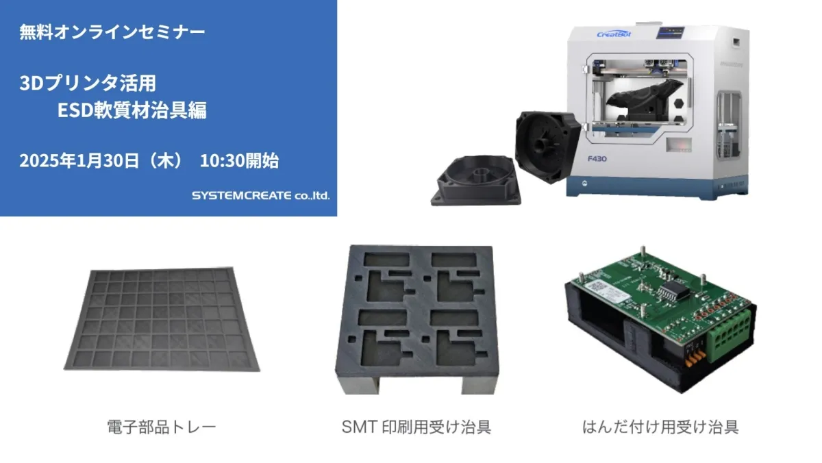株式会社システムクリエイトは、2025年1月30日(木)に免费的なオンラインセミナーを開催します。このセミナーでは、「低予算でできる小物2次切削設備」をテーマに、特に3Dプリンタを活用したESD軟質材治具について詳しく解説します。