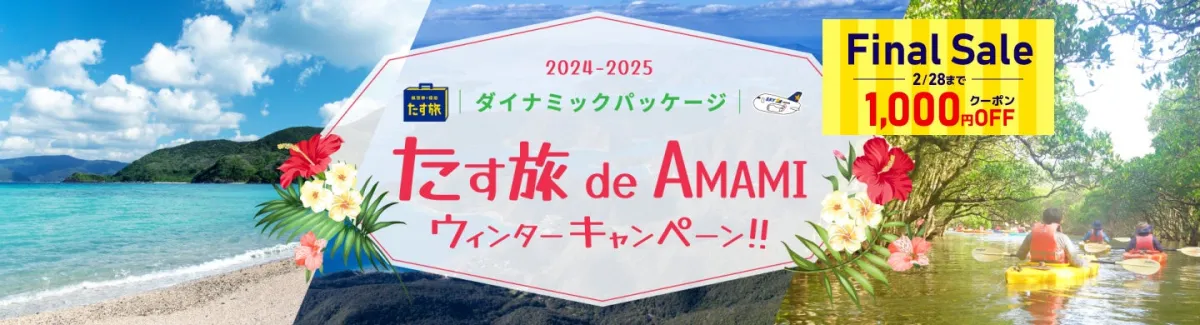 スカイマークが提供するダイナミックパッケージ『たす旅』では、奄美大島をお得に訪れるための特別キャンペーンが実施されています。「たす旅 de AMAMI ウィンターキャンペーン!!」が2024年12月5日から2025年2月28日までの期間、さらにファイナルセールも行われ、2月18日からは対象旅行に対して1,000円OFFのクーポンが配布されます。
