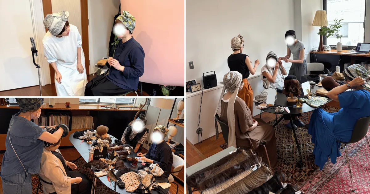 試着会では、BARENのオフィス兼アトリエに並べられたスカーフハットや前髪ウィッグを自由に試すことができます。自分に合ったカラーやデザインを選びながら、BARENのデザイナーやスタッフと共にスタイリングの相談ができます。この時間は、色やデザインの発見だけでなく、参加者同士の交流も楽しむことができる特別な場です。