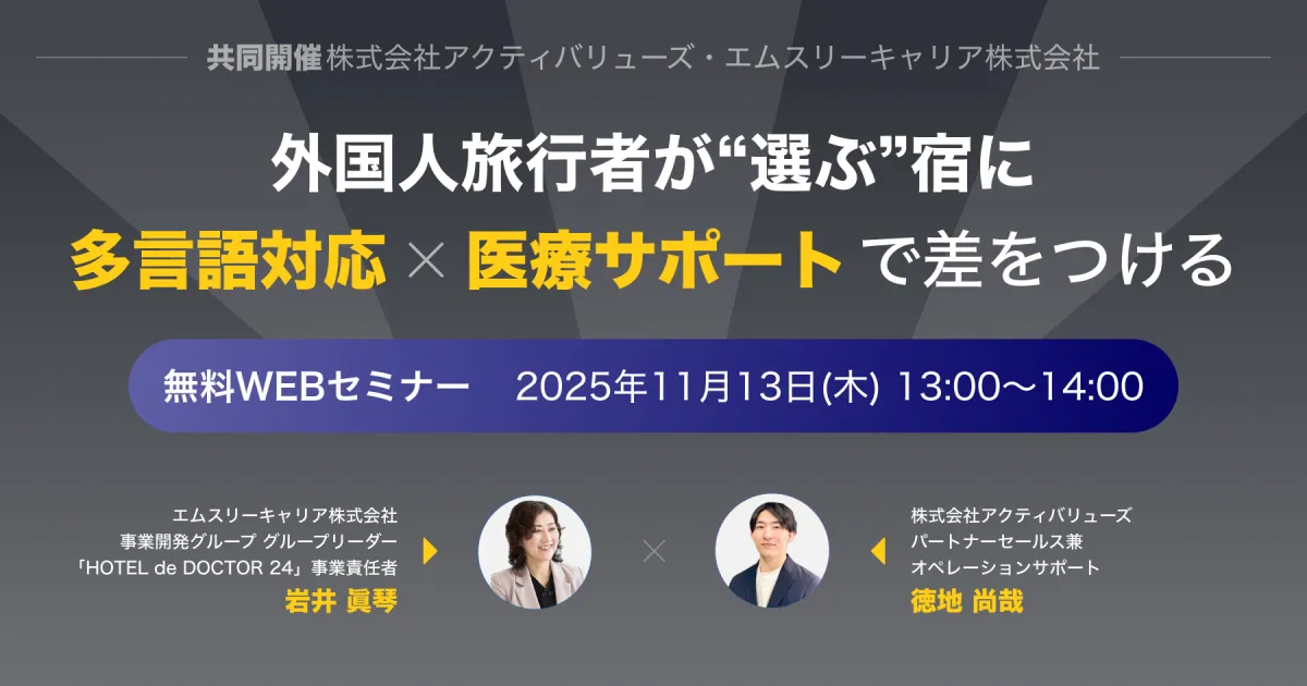 エムスリーキャリア株式会社と株式会社アクティバリューズは、訪日外国人旅行者の増加に伴い、宿泊施設が直面するフロント業務の負担を軽減し、より安心して宿泊できる環境を提供するためのセミナーを開催します。