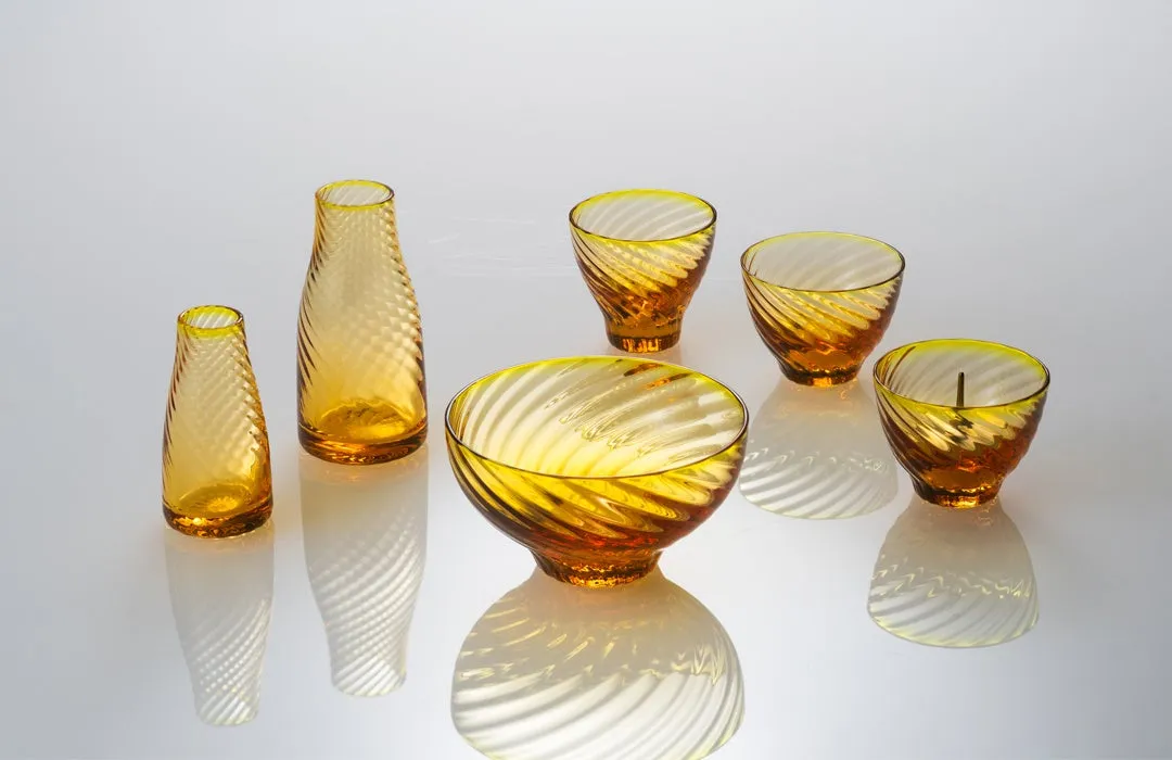 流彩はすべて職人の手作業によって丁寧に作られており、工房ではガラスの温度を読み取る能力が求められます。職人がガラスを型に押し込み、慎重に加工することで、流れるようなラインと形状が生まれます。これにより、確かな品質が確保されています。
