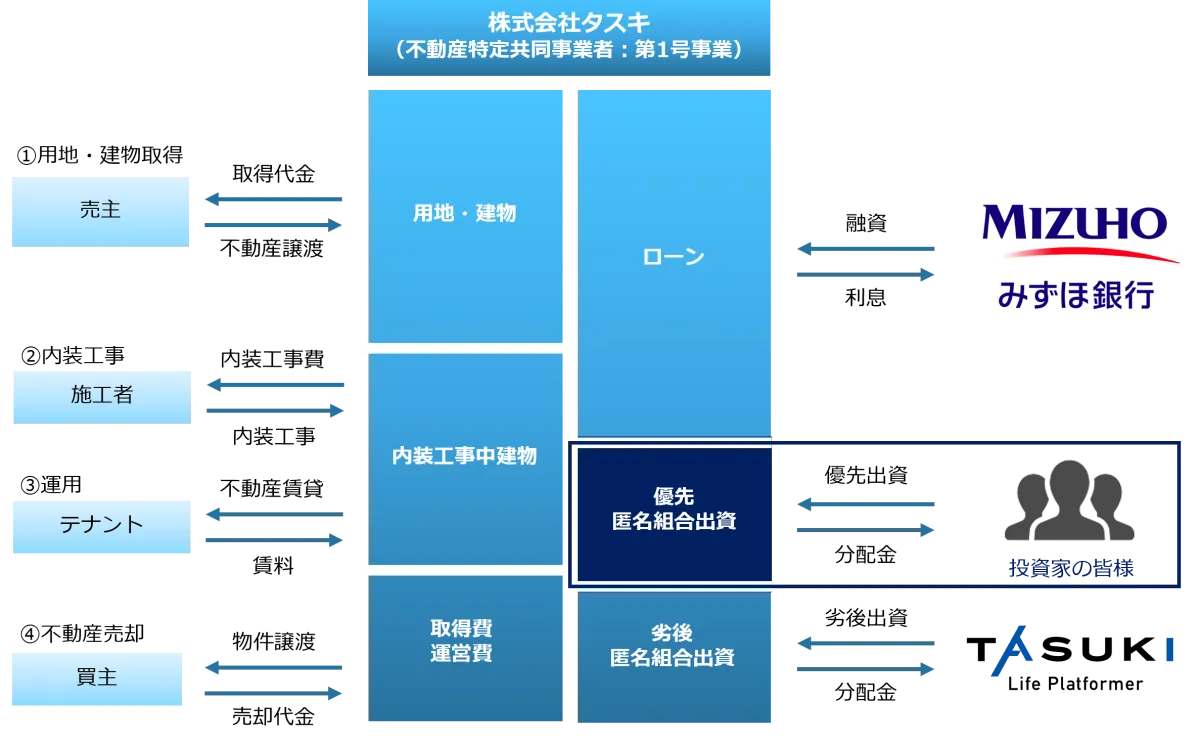 今回のファンドでは、優先劣後方式が採用されています。これにより、投資家は400口の優先出資分を募集し、タスキ社は2,000口を劣後出資します。もし損失が生じた場合、タスキ社が先に損失を負担し、投資家は優先的に出資金の返還が受けられる仕組みです。この取り組みによって、投資家のリスクを軽減し、より安心して投資ができる環境を整えています。