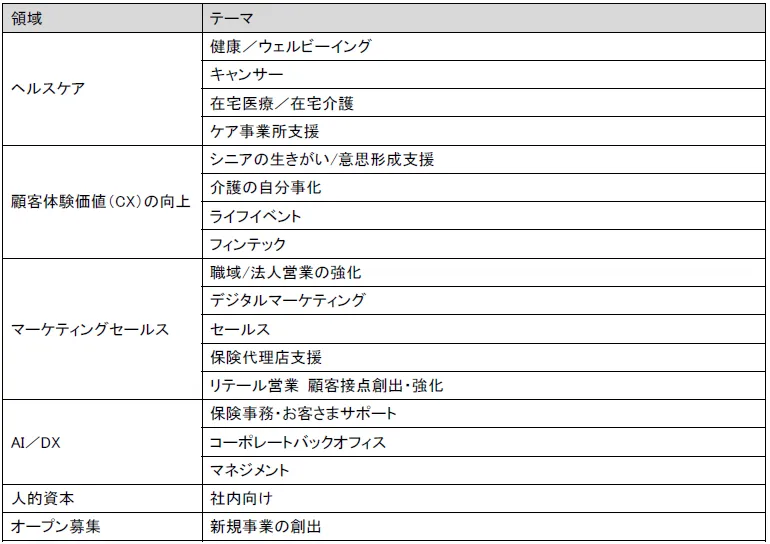 「かんぽ生命 - アフラック Acceleration Program 2026」では、ヘルスケア、顧客体験価値の向上、マーケティング・セールス、AI/DX、人的資本の5つの領域に加え、特定のテーマを定めない「オープン募集」も行います。このオープンなアプローチにより、より幅広いアイデアを収集し、スタートアップとの協業を活性化させる狙いがあります。