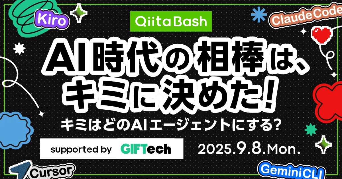 日本最大級のエンジニアコミュニティ「Qiita」が、2025年9月8日(月)にオフラインのトークイベント「Qiita Bash」を開催します。今回のテーマは「AI時代の相棒は、キミに決めた!〜キミはどのAIエージェントにする?〜」。
