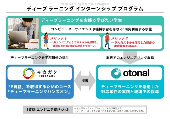 音声UX/UIサービスを手掛ける株式会社オトナルと、機械学習への教育とコンサルティングを行う株式会社キカガクが共同で、最先端のAI技術を学ぶことができる新たなインターンシッププログラム「ディープラーニングインターンシッププログラム」を2019年3月26日から開始します。このプログラムは、技術を学びながら資格を取得し、実務経験も積むことができる、学生にとって非常に魅力的な機会です。