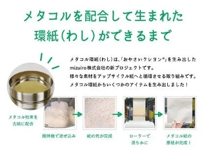 mizuiro株式会社は、metacol™の社会実装に向けた重要な役割を担っています。具体的には、metacol™を配合した新しい紙素材「環紙(わし)」を開発するとともに、それを使った各種製品、たとえば帽子や封筒、ギフトバッグ、ギフトボックスなどの製品化を進めています。これにより、日常生活に環境に優しい素材が浸透することを目指しています。