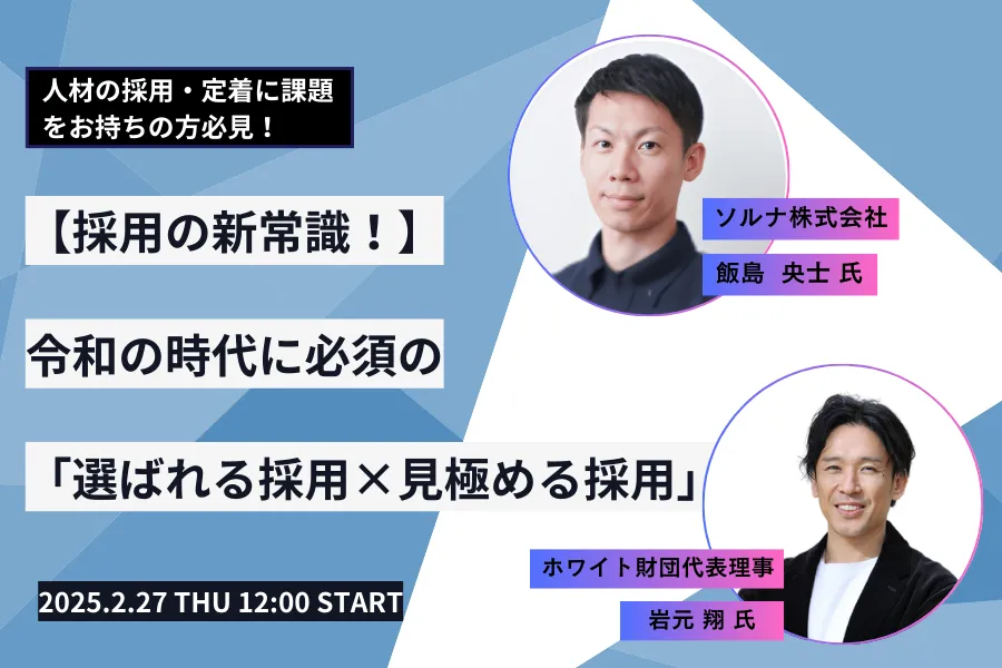 このウェビナーでは、採用活動を通じて経営に与える影響や、最適な人材を見抜くための方法論を解説します。講師には、ホワイト企業認定を推進する岩元翔氏と、ソルナ株式会社でWebリスクコンサルタントとして活躍する飯島央士氏を迎え、具体的な施策を紹介します。