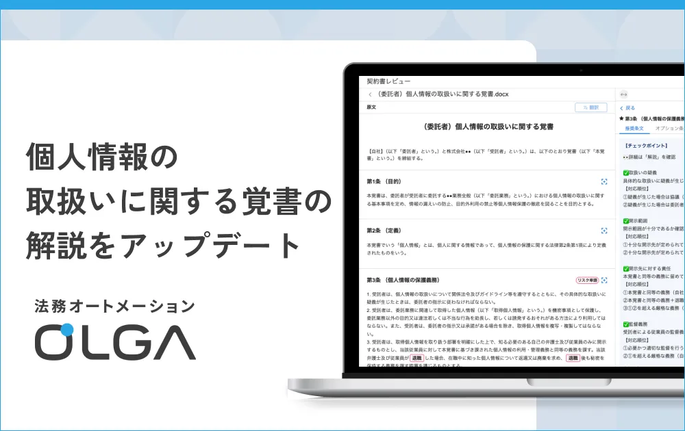 GVA TECH株式会社が提供する法務オートメーション「OLGA(オルガ)」に新たな機能が追加されました。今回のアップデートは、個人情報の取り扱いに関する覚書の内容を更新し、より実用的に契約書レビューを行うための情報が充実したものです。