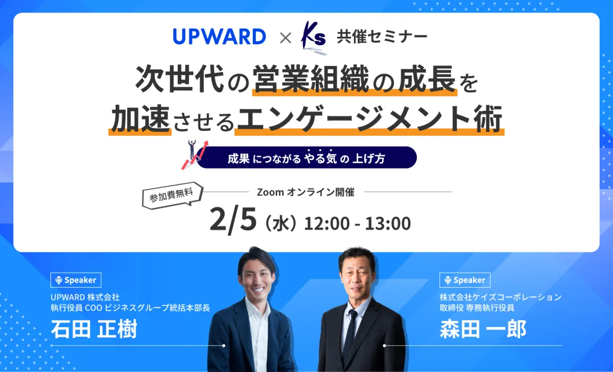 来る2025年2月5日水曜日、株式会社ケイズコーポレーションとUPWARD株式会社の共催によるオンラインセミナー「次世代の営業組織の成長を加速させるエンゲージメント術 〜成果につながるやる気の上げ方〜」が開催されます。このセミナーは無料で参加でき、特に営業に関わる皆様にとって貴重な機会となるでしょう。