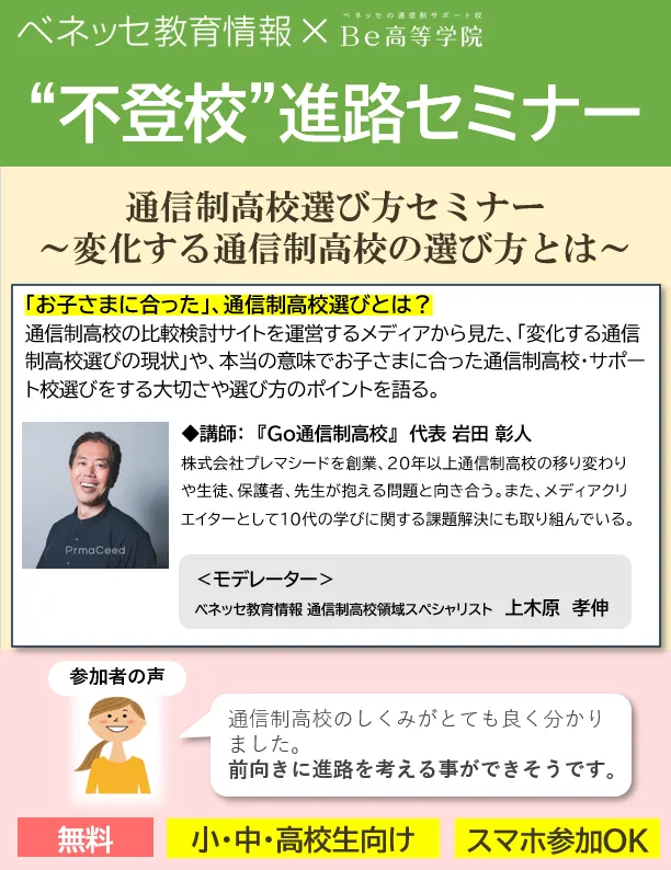 2025年1月29日(水)の19時から20時にかけて、ベネッセ教育情報とBe高等学院が共同で主催するオンラインイベント「通信制高校選び方セミナー」が開催されます。このイベントでは、株式会社プレマシードの代表取締役、岩田彰人が登壇し、現代の通信制高校の選び方について講演を行います。