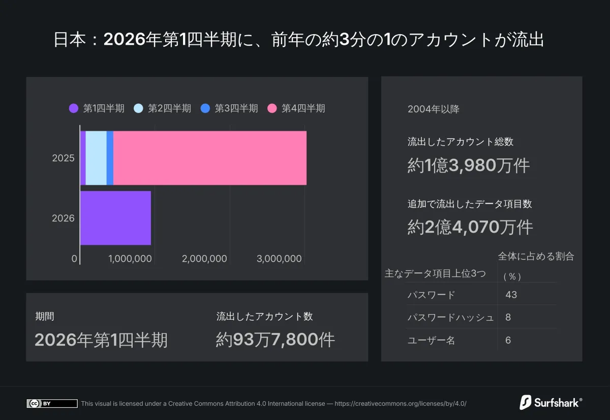 2026年第1四半期、日本ではユーザーアカウントの流出が深刻な状況となり、Surfsharkの調査によれば、全世界で最も被害が多い国の中で日本は18位に位置しています。この四半期だけで、約100万件(942,800件)のアカウントが流出し、毎分7件のペースで新たな流出が発生しています。この数字は、個人情報の保護が急務であることを示しています。