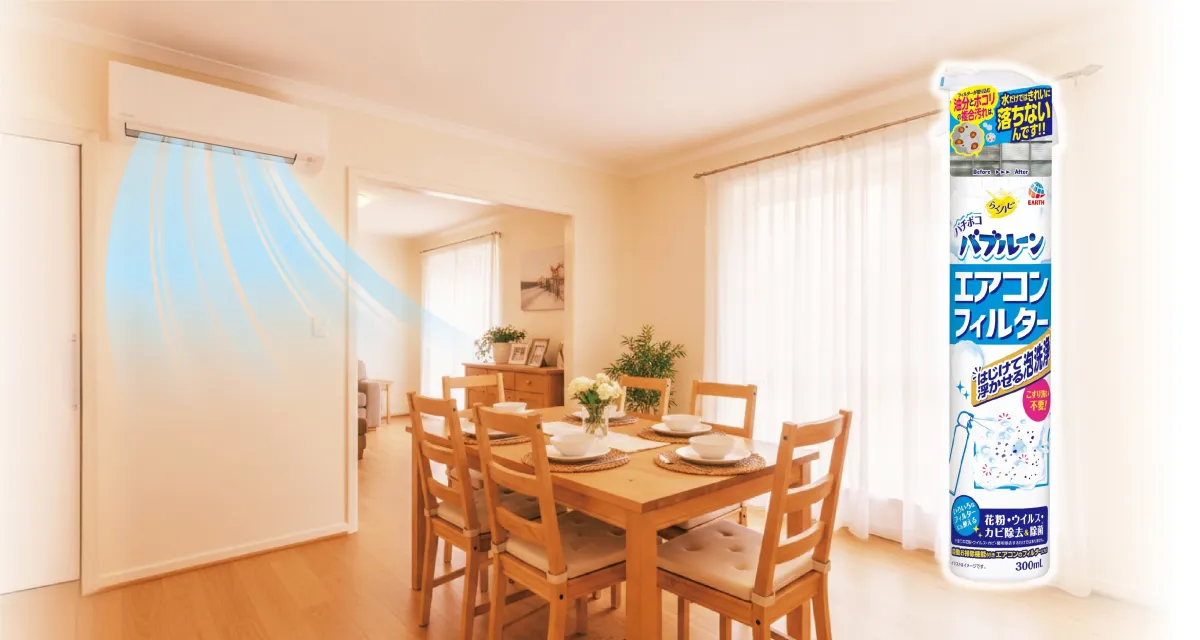 さらに、花粉やカビも洗い流すことができ、この製品はエアコンフィルターだけでなく、空気清浄機や浴室乾燥機のフィルター、換気口のフィルター、そのほか網戸など、家庭内のさまざまなフィルターに使用可能です。この1本で多くの場所のお手入れができるため、非常に便利です。