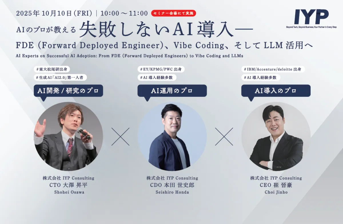 I.Y.P Consultingは「FDE(Forward Deployed Engineer)」という新たな概念を用いた、現場でのAI導入を実現するサービスを提供します。AIの導入は難しい、というイメージがありますが、同社は構想から実運用まで、一貫したサポートを行います。特に「どこから始めればよいか分からない」や「導入方法に悩んでいる」といったクライアントのニーズに対して、実用的な解決策を提案します。これにより、単なる試行的導入に留まらず、事業全体に根付くAIの活用が期待できます。