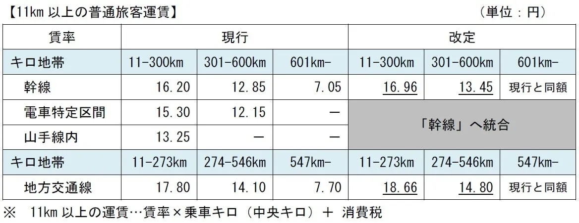 特定区間の統合:「電車特定区間・山手線内」の運賃を「幹線」に統合し、これまでの歴史的背景から設定されていた低価格を見直します。これは競争力の維持を図るための措置です。