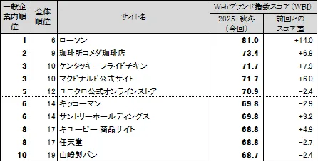 一般企業サイト編では、「ローソン」がトップ。続いて「珈琲所コメダ珈琲店」や「ケンタッキーフライドチキン」、「マクドナルドの公式サイト」が同点で第3位となりました。ローソンは、全ての評価指標でスコアを向上させ、特に企業活動に関する評価が高かったです。サステナビリティやお客様の声を基にした取り組みが、その評価を後押しした可能性があります。