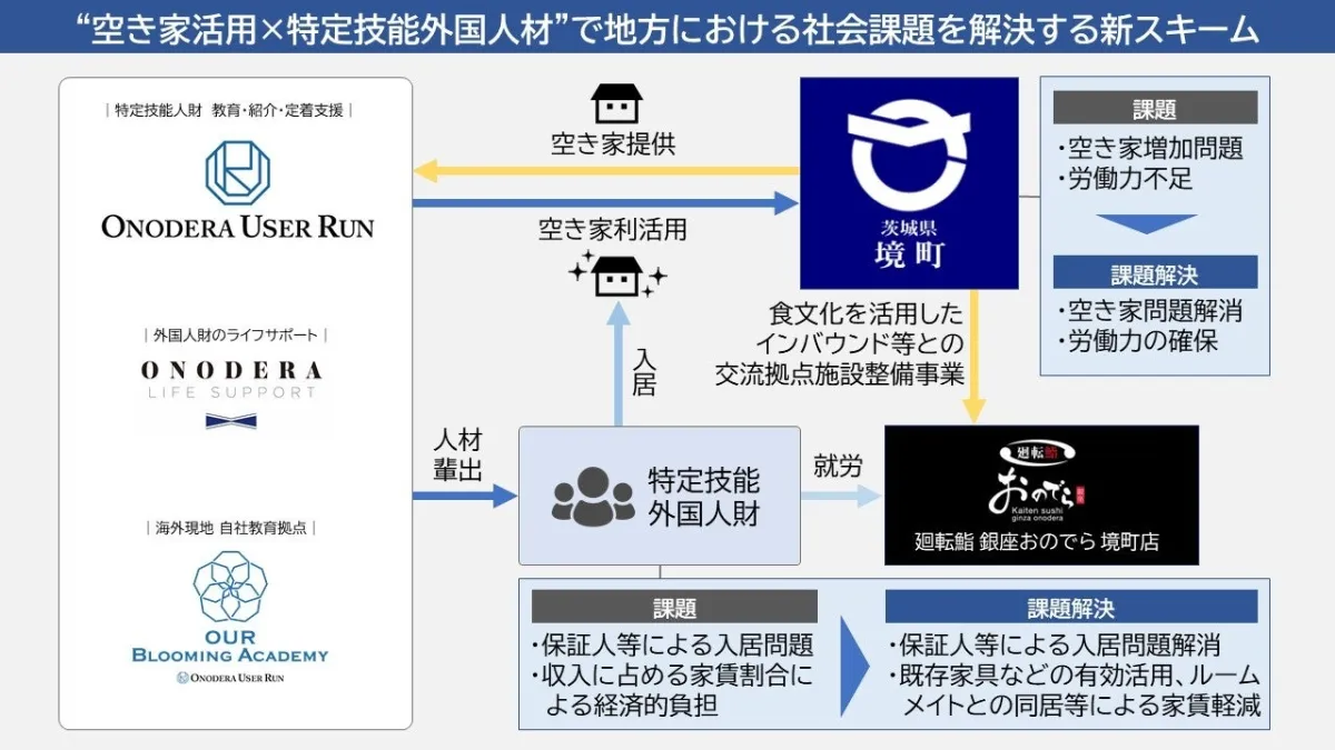 株式会社ONODERA USER RUN(OUR)は、地方の人手不足や空き家の増加といった社会課題に立ち向かうべく、茨城県境町と協力して新たなプロジェクトを立ち上げました。このスキームは、特定技能外国人材の紹介を通じて地域の活性化を目指し、空き家を有効活用することにあります。