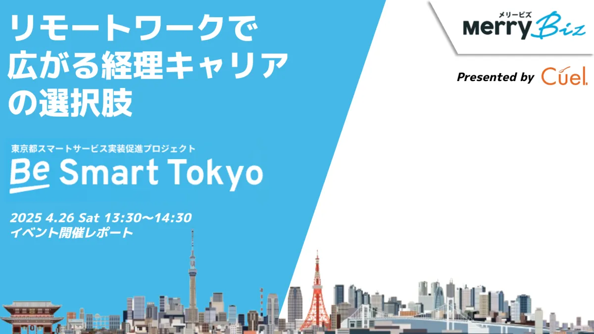 2025年4月26日、東京都内で行われたイベント「リモートワークで広がる経理キャリアの選択肢」では、メリービズとCuelが共同で、経理職における柔軟な働き方の重要性が語られました。このイベントは、東京都が進める「Be Smart Tokyo」プロジェクトの一環として実施され、業界内外から多くの参加者が集まりました。