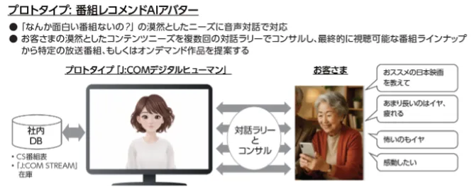 プロトタイプ版の「デジタルヒューマン」は、J:COMが培ったコンテンツ紹介のノウハウやLupinusのAI技術を融合させており、お客様の興味や気分に基づいた最適な作品の提案を行います。検索機能においては、各作品のメタデータを活用して精度高く絞り込む仕組みが実装されており、数多くのコンテンツからピンポイントでのレコメンドが可能となっています。