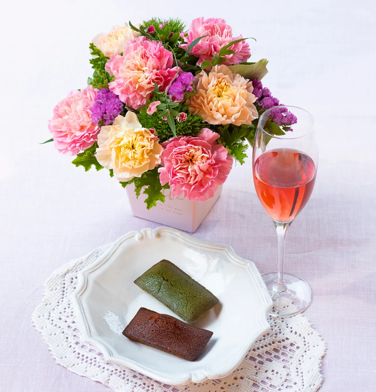 注目のアレンジは「ルミナ」という名前がついています。これはラテン語の「lumen(光)」に由来し、お母さんに生き生きとした光を贈りたいという願いが込められています。カーネーションの美しさと、高級フィナンシェの絶品が一つのパッケージにまとめられています。特別な味わいのフィナンシェ5個セットには、塩キャラメル、チョコレート、宇治抹茶、ホワイトトリュフ、プレーンなど、全て厳選された素材で作られています。