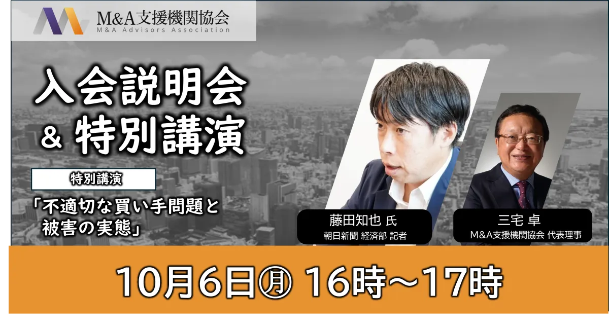 今回の入会説明会では、特に注目すべき特別講演があります。朝日新聞の経済部記者である藤田知也氏をお招きし、「不適切な買い手問題と被害の実態」というテーマでお話をいただきます。この講演では、藤田氏が取材を通じて得た、M&Aにおける不適切な買い手の実態やその被害を受けた方々の人生についての深い洞察が提供される予定です。また、M&A支援機関が果たすべき役割についても議論がなされるでしょう。
