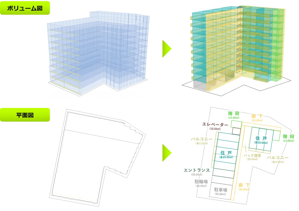 従来のVer.1.2から進化したVer.2.0では、避難経路や採光・通風スペースの考慮が新たに加わったため、実際の設計にも適用できるプランが多くなっています。これにより、マンション開発プロセスにおいて、ボリュームプランの生成精度が向上し、事業性評価がより迅速かつ低コストで行えるようになりました。