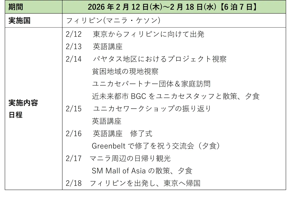 また、本プログラムにはNPO法人「ユニカセ」が協力しており、ケソンの貧困地域を訪問し、地域の人々と交流します。この体験を通じて、フィリピンが直面するさまざまな社会課題について直接触れることができ、現地の方々から実情を聞くことができます。こうした体験は、生徒にとってただの楽しみではなく、将来のキャリア形成や進路選択にもつながる重要な学びとなります。