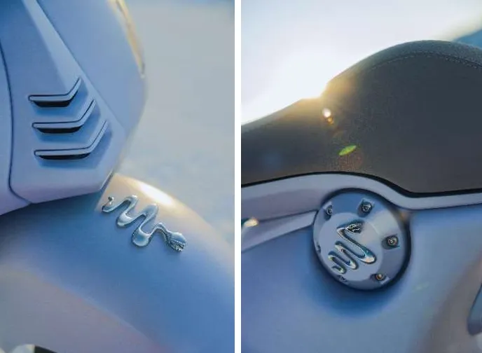 946 SNAKEのデザインは、冬の雪景色からインスピレーションを受けており、氷のような色合いで虹色に光を放つブルーの塗装が特徴です。この色合いは、純粋さと力強さの象徴とされており、冬の幻想的な風景を反映しています。ハンドルグリップとシートには、蛇の鱗を模した柔らかな表面を使用し、強さと優雅さが融合した独自のデザインが際立っています。さらに、サイドオーナメントのクロームメッキのスネークエンブレムが高級感を引き立てます。