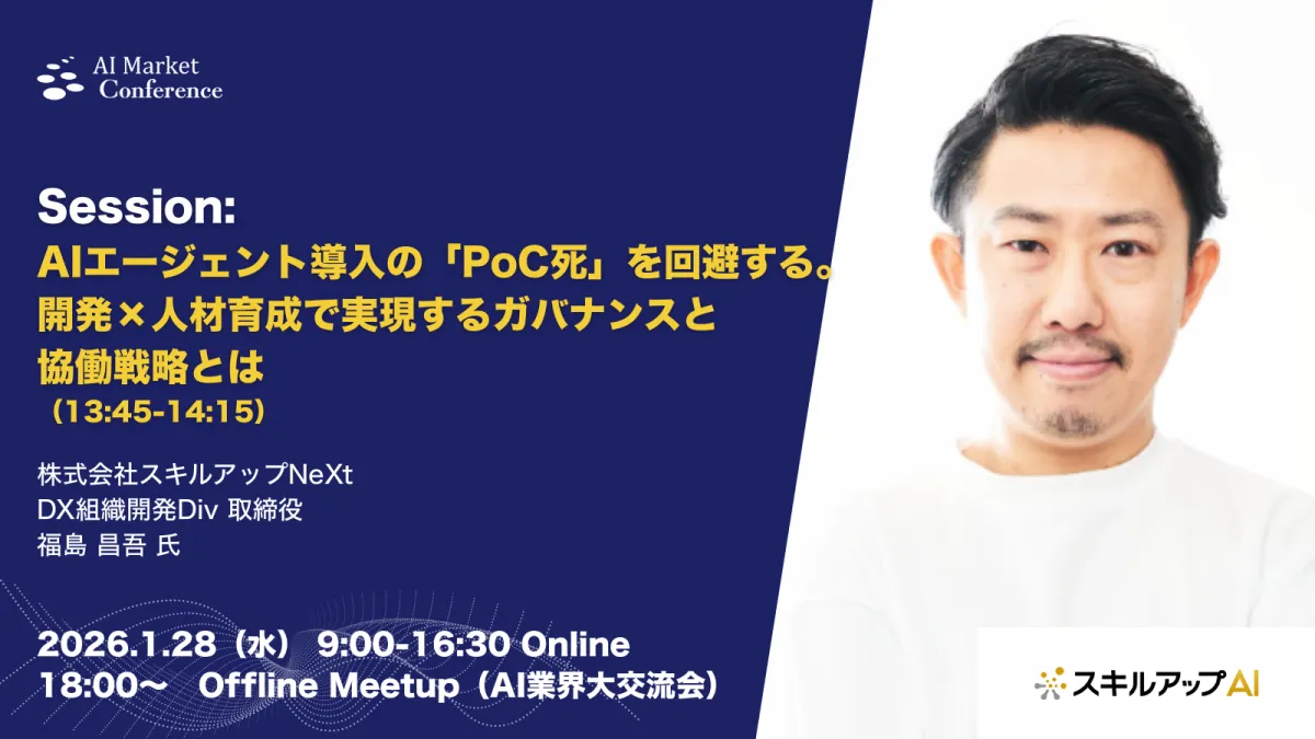 2026年1月28日、国内最大級のAIカンファレンス『AI Market Conference 2026』が開催され、株式会社スキルアップNeXtから福島昌吾氏が登壇し、AIエージェント導入における重要な戦略についての講演を行います。今回は、その内容について詳しくご紹介いたします。