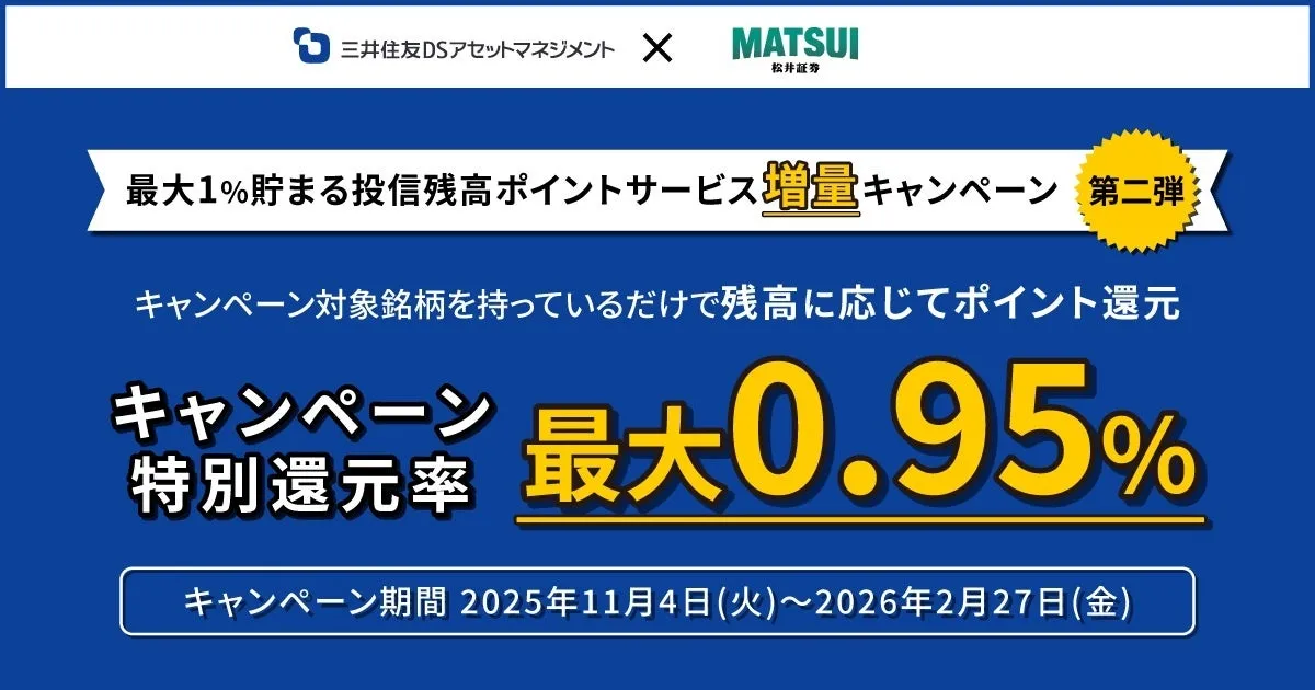 松井証券株式会社は、2025年11月4日から三井住友DSアセットマネジメントとのコラボレーションキャンペーンを実施します。このキャンペーンでは、特定の2つの投資信託銘柄に対するポイント還元が大幅にアップします。