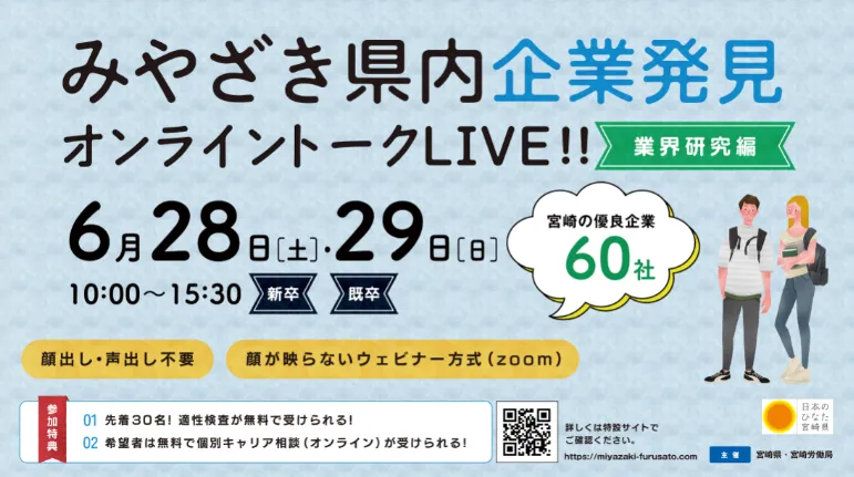 宮崎県が主催するオンライン就職イベント「みやざき県内企業発見オンライントークLIVE!!」が、2023年6月28日(土)と29日(日)の2日間にわたり開催されます。このイベントは、県内外の大学生や求職者を対象に、宮崎県の魅力を発信する貴重な機会です。参加企業は約60社にのぼり、学生や若手社会人が驚くべき体験を得ることができます。