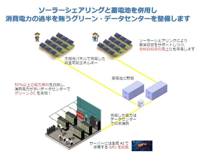 本プロジェクトの特異な点は、データセンターが農業と連携して運営される点です。太陽光パネルを設置し、その下部空間を利用して農業を行う「ソーラーシェアリング」の概念が取り入れられています。この仕組みにより、農業経営をサポートし、荒廃した農地の再生にも貢献することが期待されています。